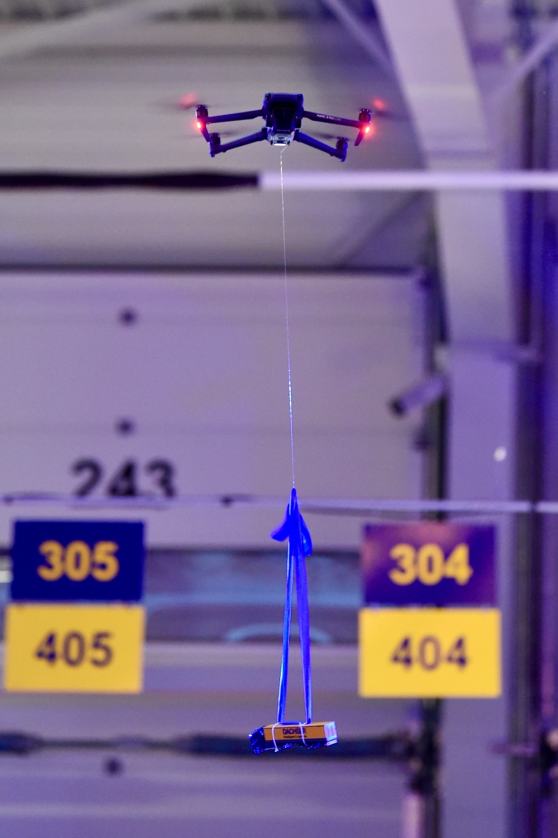 Au bout du drone est attaché une maquette de camion aux couleurs de l’entreprise. Le drone survole les invités pour apporter le camion aux dirigeants qui achèvent leur discours, découpent un ruban et posent le camion sur un socle avec une gerbe d’artifices.